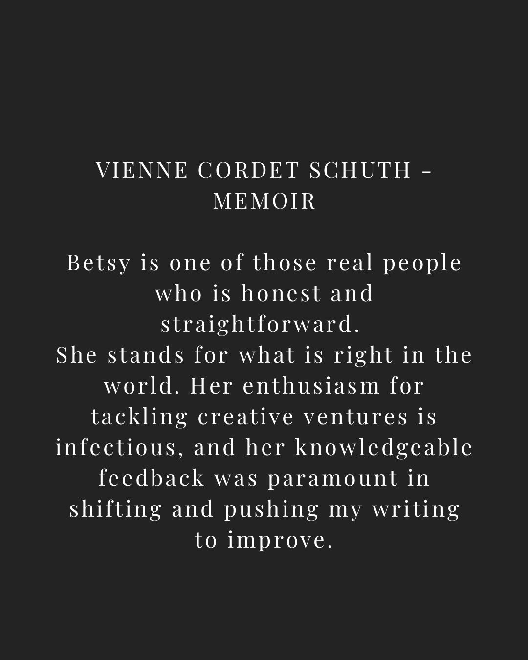 "I am loving the process that Betsy guides us through in our MasterMind group. It's forcing me to dig deeper, ask tougher questions and face things I may have skirted over had I been writing on my own. The process is also becoming a beautiful container for greater inspiration to flow. I am remembering moments and events that I had forgotten that I definitely want to include in the story! Thank you so much, Betsy, for the expertise and for the love and support. You provide a perfect balance of honest feedback and cheerleading as I move through raw vulnerability toward authentic expression."